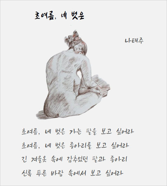 날씨는 슬슬 더워지고 있는 것 같다. 어제까지만 해도 선선하던 날씨가 20일부터 30도가 넘으면서 본격적인 더위를 예고하고 있다. 민소매 셔츠와 반바지가 등장하는 등 노출의 수위도 점점 높아지고 있다. 나태주 시인의 시 ‘늦여름, 네 벗은’을 읽으면서 시인이 호명한 이가 ‘그녀’인지, ‘초여름’인지를 곰곰이 헤아려 본다.
