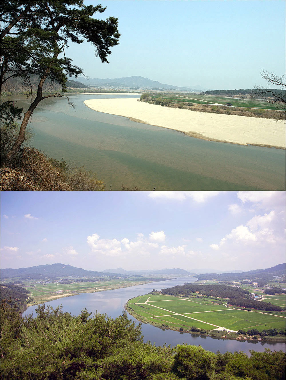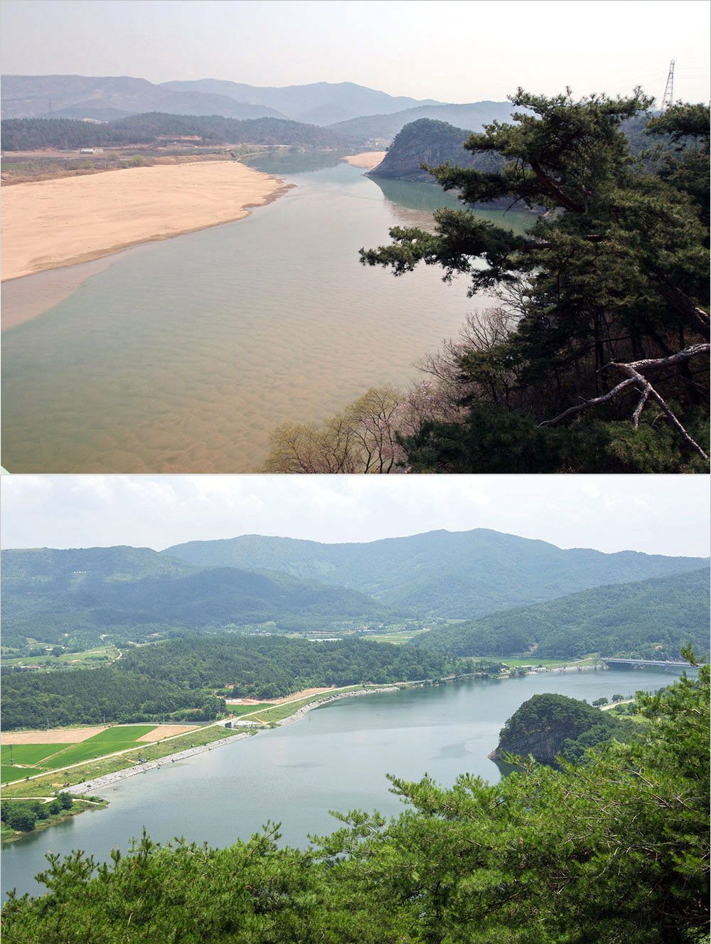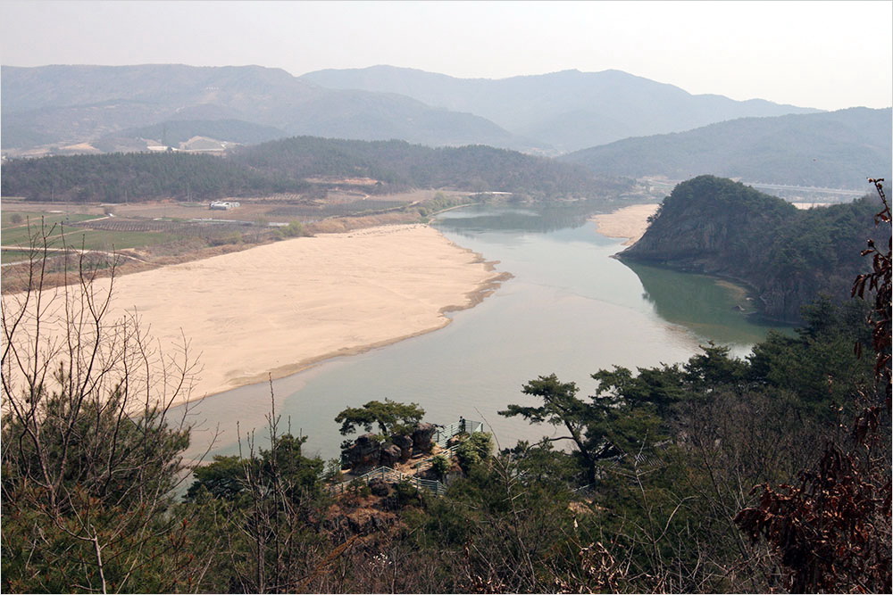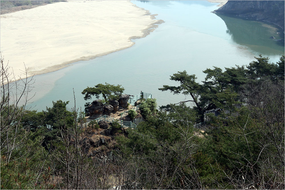 그나마 통나무를 가로질러 지은 계단 바닥이 맨땅인 점은 마음에 들었다. 5분쯤 계단 길을 오르자 날렵한 산마루에 전망대 건물이 나타났다. 전망대 맨 위층에서 내려다보는 강은 예전의 그 강이었다. 그러나 뭔가 허전한 느낌이 있다. 그게 모래톱이 사라져 버려서라는 걸 이내 깨닫는다.