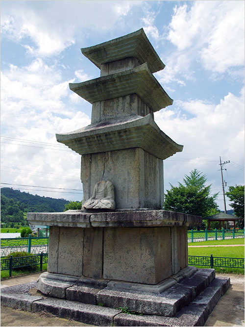 단층 기단에 3층 탑신부로 된 탑의 상륜부는 노반석 등 아무것도 남아 있지 않다. 9세기 신라 하대의 작품으로 추정하는데, 기단 위에 목이 떨어진 석불좌상이 얹혀 있다. 탑이 다섯 기나 있었다는데 정작 절집의 자취는 남아 있지 않고 사벌왕릉의 사당인 숭의각이 옆자리를 차지하고 있다.