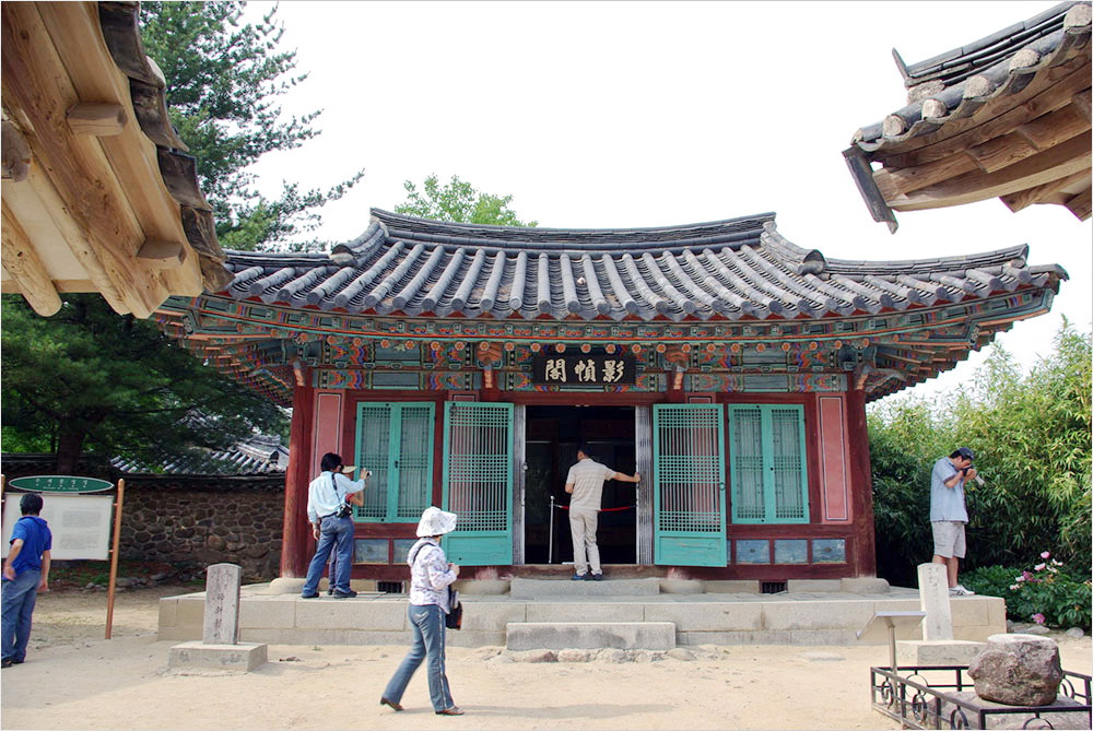 직방재 뒤편에 선 영정각에는 회헌 영정(국보 111호)과 대성지성문선왕전좌도(大成至聖文宣王殿坐圖:보물 485)가 안치되어 있다. 궁벽한 시골 마을에 자리 잡은 서원인데 소장 문화재가 만만치 않다. 영정각 오른편은 대숲인데, 그 아래 화단에 작약이 지고 있었다.