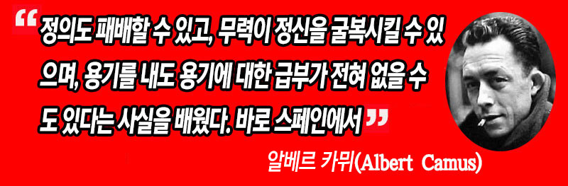 국제 여단의 분투에도 불구하고 프랑코의 승리로 끝난 스페인 내전에 대한 카뮈의 지적은 씁쓸하고 아프다.