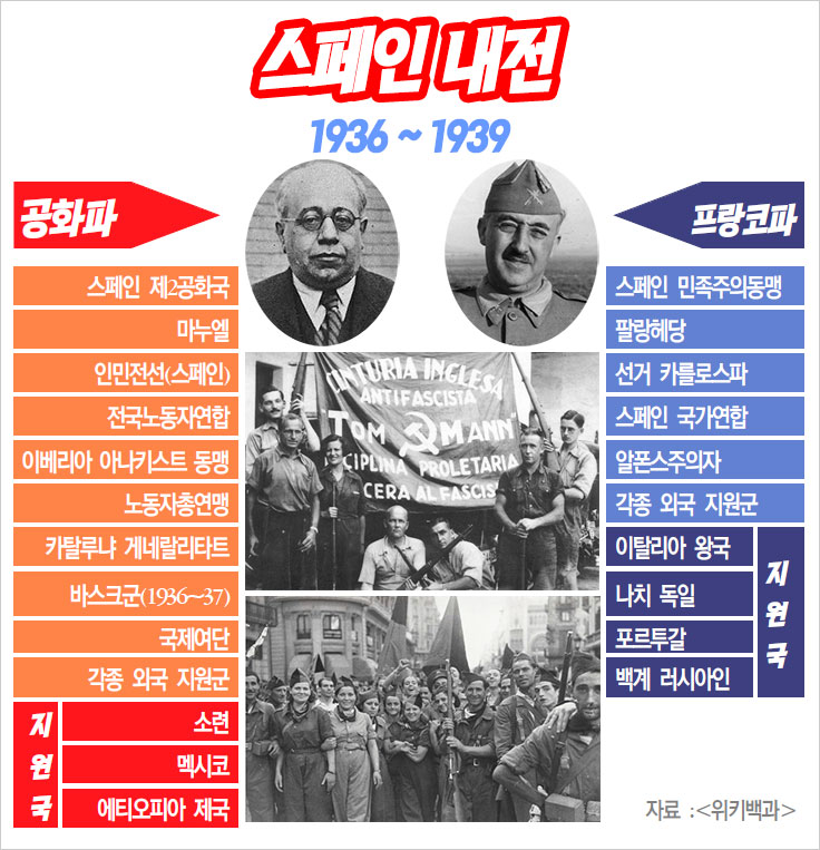 1936년 7월 17일, 프랑코 장군이 지휘하는 모로코 주둔군이 스페인 제2공화국의 인민전선 정부에 반대하는 군사반란을 일으키면서 파시즘과 반파시즘이 격돌한 스페인 내전(Spanish Civil War)이 시작되었다.