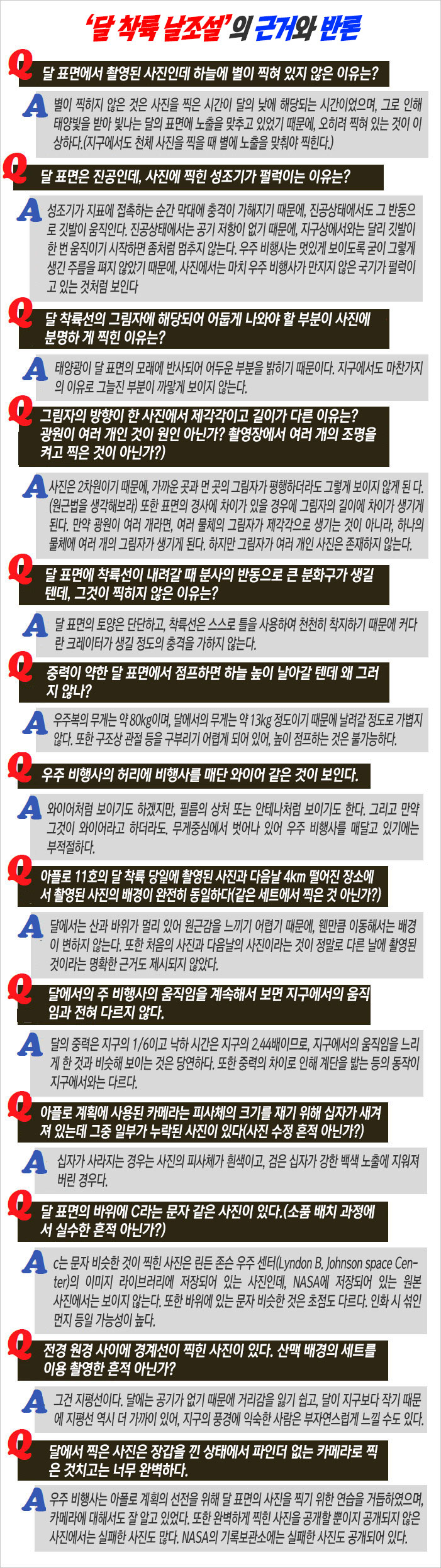 음모론은 매우 정교한 논리로 대중을 설득한다. 그게 단순한 호기심이나 흥미를 위해 제기되지 않았다는 방증이다. 물론 이 조작설의 근거는 강력한 반론에 부딪힌다. 조작설의 근거는 사진·영상에 관련된 것과 과학·기술과 관련된 것으로 나뉘는데 그 설득력이 만만치 않다. [사진·영상 관련 근거는 아래 그림 참조 나머지는 <위키백과> 참조]
