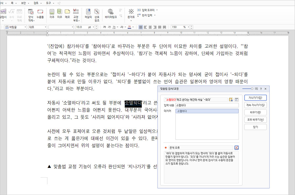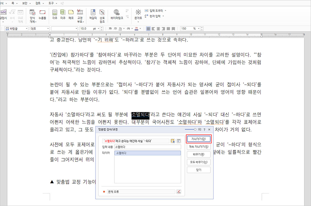 그럴 때 사용자의 선택은 간단하다. 맞춤법 교정 표시가 오류라 판단하면 ‘지나가기’ 단추를 눌러서 ‘오류로 지적된 단어를 교정하지 않고 지나가면 되’는 것이다.