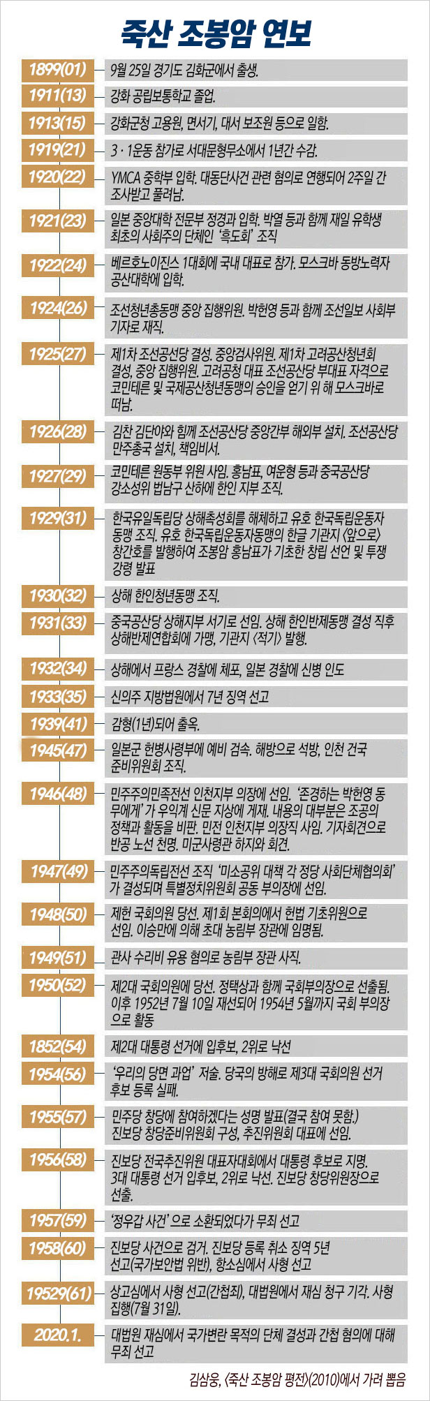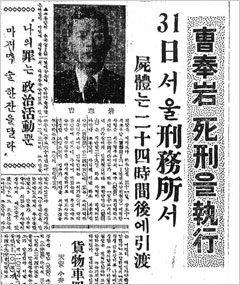 유언에서 밝혔듯 ‘국민 대다수를 고루 잘 살리기 위한 민주주의 투쟁’을 했던 조봉암을 이승만 정권은 간첩으로 조작하여 처형하였다. 이 최초의 ‘사법살인’은 <민족일보> 조용수 사장[관련 글 : <민족일보> 폐간과 조용수], 인민혁명당 사건[관련 글 : 야만의 현대사-인혁당 피고 8인 사형 집행] 등 또 다른 사법살인으로 이어지면서 나라 안에 진보정당과 진보정치의 맥을 끊어버렸다.