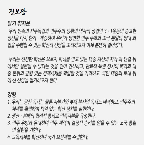 “우리는 남북한에서 평화통일을 저해하는 요소를 견제하고 진보당 세력의 주권 장악하에 ‘피 흘리지 않는 평화적 한국통일’을 실현한다.”