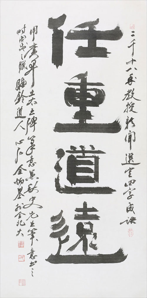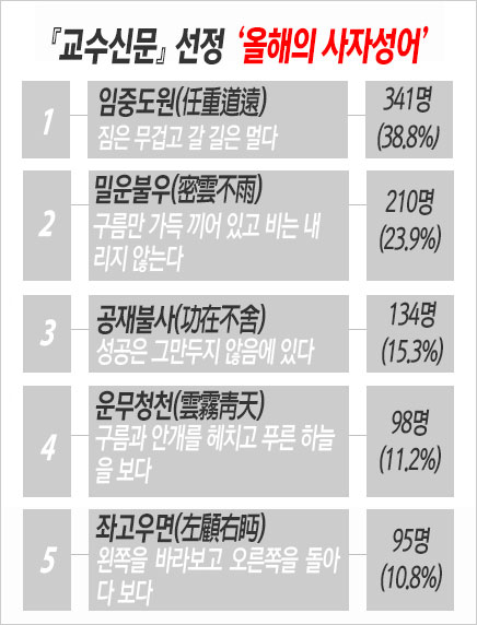 교수신문이 진행한 2018, 무술년 ‘올해의 사자성어’ 설문 조사 결과로 ‘임중도원(任重道遠)’이 선정됐다. 설문 조사에 참여한 전국 대학교수 878명 중 341명(38.8%)이 선택한 이 사자성어의 출전은 『논어』, ‘짐은 무겁고 갈 길은 멀다’는 뜻이다. (관련 기사 : 2018년 올해의 사자성어 ‘任重道遠(임중도원)’)