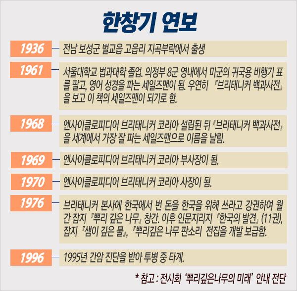 ‘한창기의 삶’에서 보듯 그는 독특한 이력을 지닌 사람이다. 법대를 갔지만, 법률가 대신 그는 장사꾼을 선택했다. 그는 미군에게 비행기 표와 영어 성경을 팔던 그는 마침내 『브리태니커 백과사전』을 세계에서 가장 잘 파는 세일즈맨이 되었고 이를 바탕으로 엔사이클로피디어 브리태니커 코리아의 사장 자리에 올랐다.