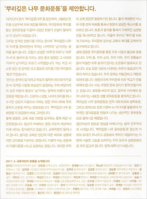 이번 전시회를 열면서 주최 측과 문화계 인사들은 ‘뿌리 깊은 나무 문화 운동’을 제안하고 있다. 한창기의 뜻을 이어 ‘반말 없는 사회’, ‘교육과정 개편을 요구하는 정책 제안 시민운동’, ‘우리 문화를 통한 치유사업의 활성화 운동’ 등을 펴자는 것이다.