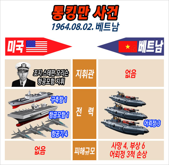 1964년 8월 2일은 일요일이었다. 이날, 미국 언론들은 베트남 통킹(Tonkin)만 해상에서 정찰 중이던 미국의 구축함 매덕스(USS Maddox)가 북베트남의 어뢰정으로부터 공격을 받았다고 보도했다.
