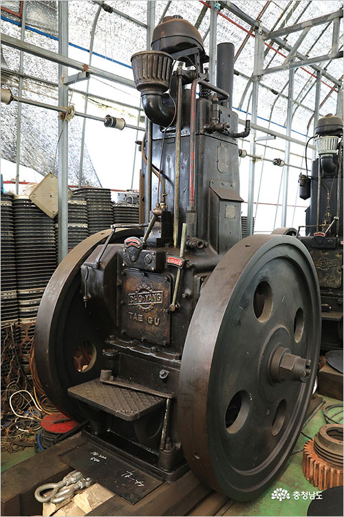 뒤에 형님이 돌아와 전력으로 공장을 돌리기까지는 방앗간은 발동기를 돌려서 동력을 얻었다. 지금은 사라진 원동기는 사진에서 보는 것처럼 거대한 쇳덩어리다. 사진 오른쪽 휠에다 스타팅 핸들을 걸어서 여러 번 돌려서 시동을 걸었다. 평상시엔 혼자 힘으로 너끈히 돌렸으나 온도가 떨어지는 겨울이면 거기에다 방아를 찧으러 온 사람들이 밧줄을 걸어서 당겨 주어야만 했다.
