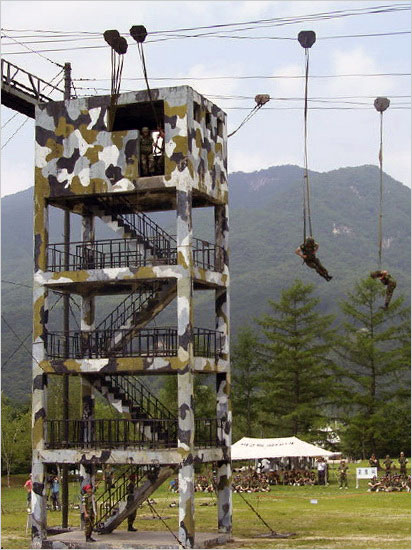 잠시 자대로 갔다가 다시 사령부 특전교육대에서 나는 공수기본교육(4주)과 특수전 교육(6주)을 받았다. 비 한 방울 내리지 않았던 그해 7월, 한 달 내내 우리는 마치 몽유병 환자처럼 교장을 뒹굴어야 했다. 가장 훈련 강도가 센 교육의 하나로 널리 알려져 있듯 공수기본교육은 인내의 한계를 넘나드는 것이었다.