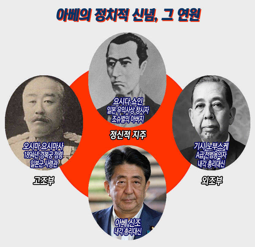 야마구치현 출신의 아베 신조는 요시다 쇼인의 숭배자고, 쇼인의 학당은 메이지 유신의 주역들을 길러냈다. 아베의 고조부인 오시마 요시마사(大島義昌)는 쇼인의 문하로 1894년 동학농민전쟁 때 경복궁을 기습 점령한 일본군 사령관이었다. 그는 조선 정부 내각을 강제로 친일내각으로 개편하였는데 청나라가 이를 인정하지 않아 뒤에 청일전쟁으로 이어졌다.