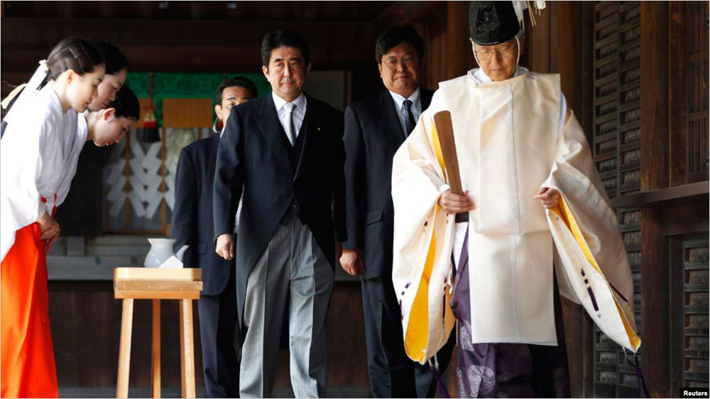1978년 태평양 전쟁 A급 전범의 합사 이후에 일왕 히로히토조차 참배를 중단한 야스쿠니(靖國)신사에 아베는 공공연히 여러 차례 공물을 바치고 참배한다. 그는 1차 아베 내각 (2006~2007) 시절, 야스쿠니를 참배하지 못한 것에 대해 ‘통한의 극치’라고 밝힐 만큼 야스쿠니신사에 집착했다.