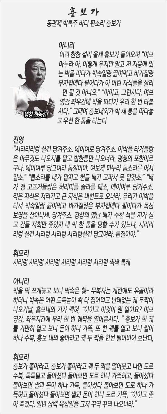 “시르르르르르르르르르르.” “큰 자식은 저리 가고, 둘째 놈은 이리 오너라. 우리가 이 박을 타서 박 속이랑 끓여 먹고, 바가지는 부잣집에 팔아다가 목숨 보명(保命) 살아나자. 에이 여루 받소.”