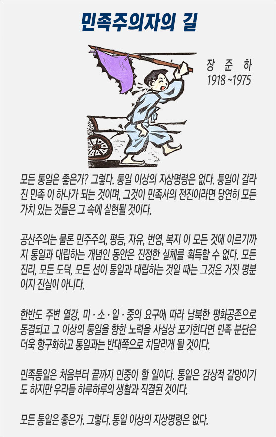 ‘민족주의자의 길’은 장준하의 통일관을 압축해 놓은 고갱이다. 국회에서 ‘통일이 국시’라는 발언으로 야당 국회의원이 제명되고, 구속된 때가 1986년이다. 장준하 선생은 ‘모든 통일은 선’이라고 부르짖는다. 그는 “그것이 민족사의 발전이라면 당연히 모든 가치 있는 것들은 그 속에 실현될 것”이라고 확신한다.