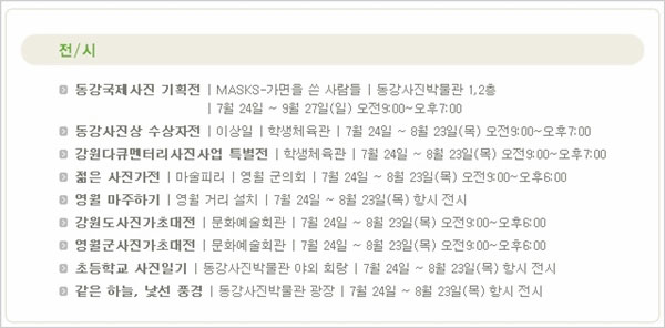영월학생체육관에서 열린 전시는 2009년 동강 사진상 수상자로 선정된 작가 ‘이상일 전’과 ‘강원 다큐멘터리 사진사업특별전’이다. 작가 이상일은 ‘망월동’과 ‘으므니’, 등의 흑백사진 시리즈를 내놨고, 강원도의 가치에 대한 인식을 높이고, 사진예술을 통하여 강원도를 기록·보존하여 활용하고자 하는 다큐멘터리 사진도 오래 눈길을 끌었다.