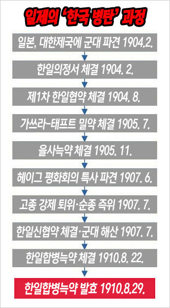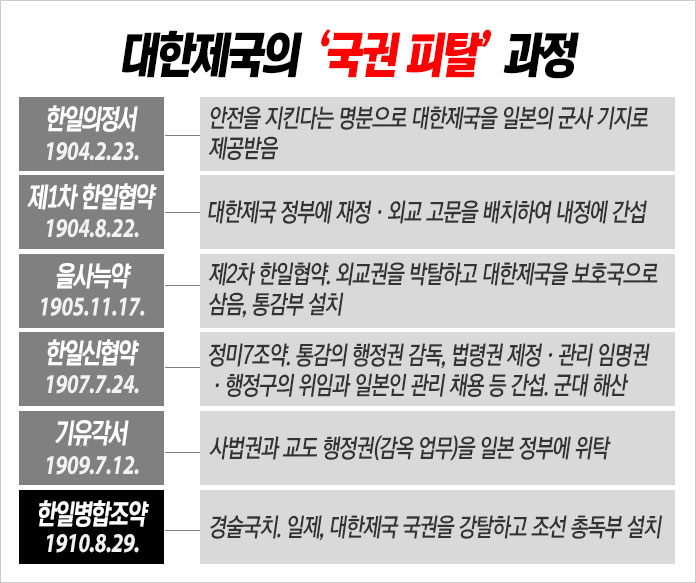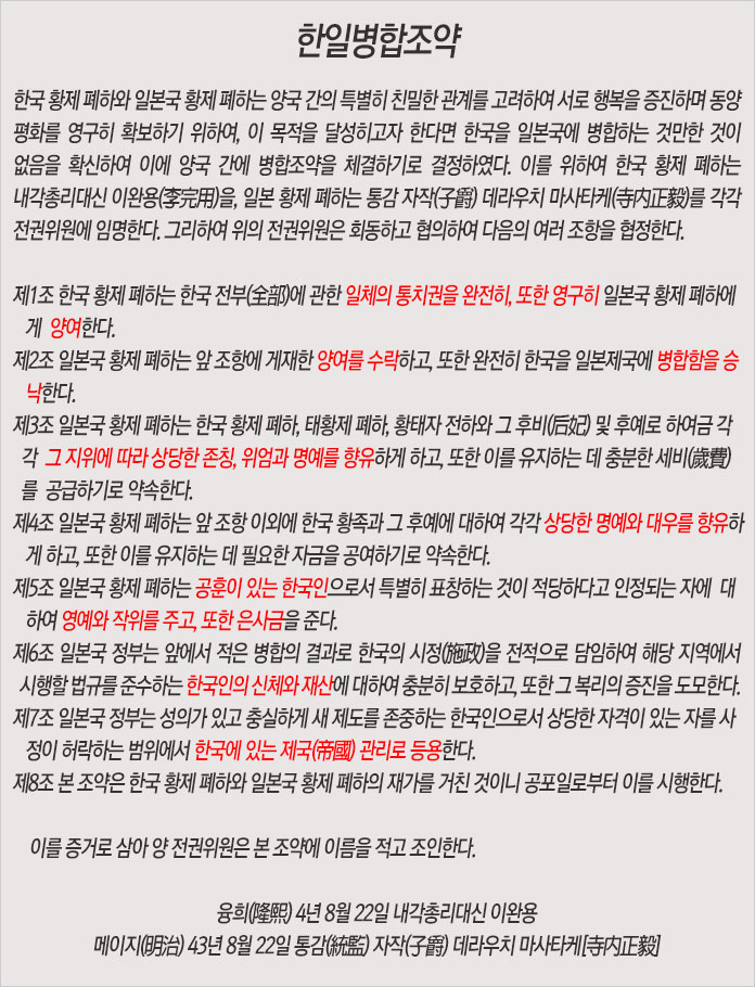 8개 조로 된 이 조약이 제1조에서 “한국 황제 폐하는 한국 전체에 관한 일체 통치권을 완전히 또 영구히 일본 황제 폐하에게 넘겨준다.”고 규정하고 있는 이유다. 이로써 519년을 이어온 조선왕조는 국권을 완전히 잃고 역사에서 퇴장하게 된 것이다.