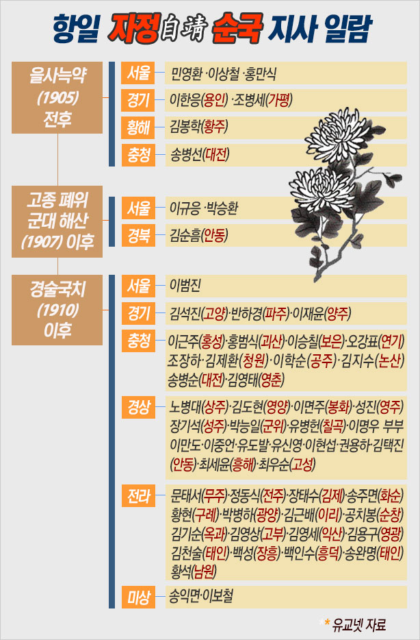 나라가 망한 뒤, 왕족과 매국의 은사를 받은 반역자들의 안락한 삶은 계속되었지만, 백성들을 기다린 것은 가혹한 식민지배와 수탈의 세월이었다. 정작 망국의 책임을 져야 할 사람 가운데 그것을 감당한 사람은 아무도 없었다. 오히려 포의의 선비들이 망국의 치욕을 죽음으로 씻었으니, 1910년에만 자정(自靖) 순국한 이가 38명에 이르렀다. [관련 글 : 포의(布衣)의 선비 황현, 망국의 책임을 대신하여 자정하다]