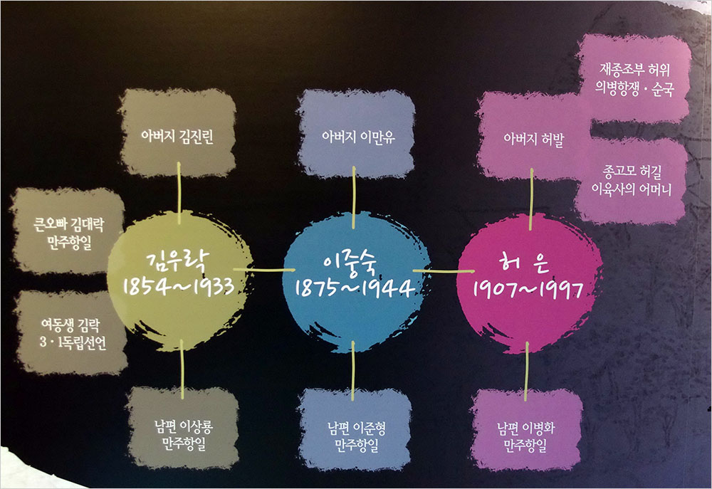 이번 전시에서 그 삶을 조명하고 기리고자 하는 이는 당연히 여인들이다. 임청각이 낳은 항일투사를 지켜낸 종부 3대(김우락·이중숙·허은), 합니하(哈泥河) 신흥무관학교에 남편 권기일(1886~1920)을 묻은 김성, 남편 배재형이 병사하자 18일 동안의 단식으로 절명한 김씨 부인, 일송 김동삼(1878~1937)의 부인 박순부와 며느리 이해동, 아들 권오헌을 따라나선 김우모 등이다.