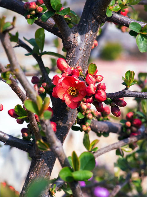 사진을 몇 장 찍었고, 나무 이름을 알아봐야지 하다가 깜빡 잊어버렸다. 그러다가 어느 날, 오블의 이웃이 쓴 글에서 ‘명자나무’라는 이름과 모습을 본 순간, 그게 내 마음에 담아 두었던 꽃이라는 걸 알았다. 바로 뜰로 나가 보았는데, 아직 꽃봉오리조차 제대로 영글지 않은 상태였다.