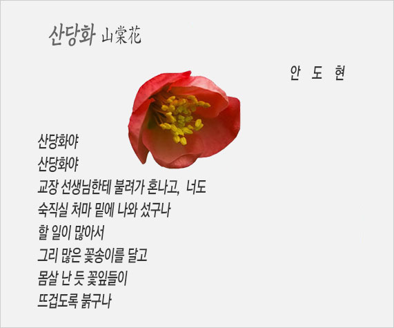 ‘명자(榠樝)’는 좀 낯선 이름이지만 ‘산당화’라는 이름은 훨씬 정겨워 보인다. 시인 안도현은 ‘산당화’라는 제목으로 시를 쓰기도 했다. 아마 그가 익산의 사립학교에 근무하던 때의 시인 듯하다. 그는 대학을 졸업하고 바로 이리(지금의 익산시)의 한 사립학교에서 교사로 일했다.