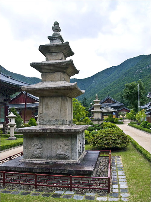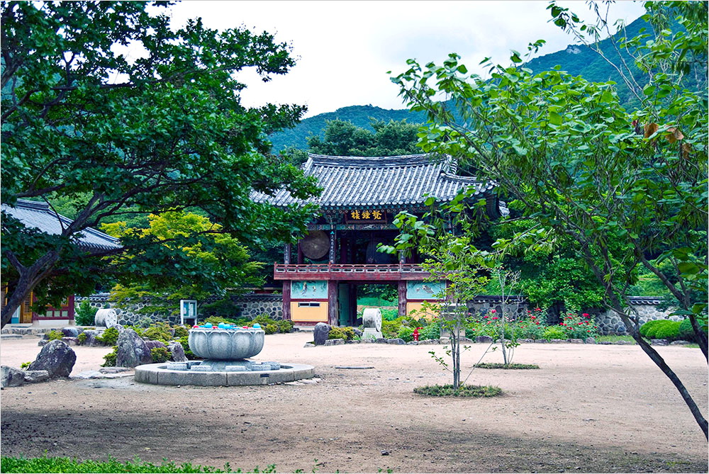 범종루 누마루 아래를 지나면 펼쳐지는 것은 나지막한 산을 배경으로 들어선 여러 채의 전각, 천연기념물이라는 처진 소나무, 그리고 왼편 화단에 무리 지어 핀 장미꽃이다. 절집에 핀 화사한 장미가 주는 울림은 좀 색다르다. 그러나 그게 ‘생뚱맞다’는 느낌으로 이어지지 않는 것은 절집이 가진 묘한 안정감과 고즈넉함 때문이다.
