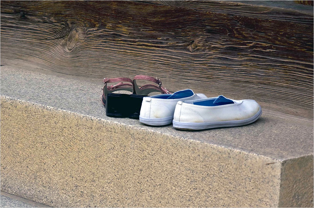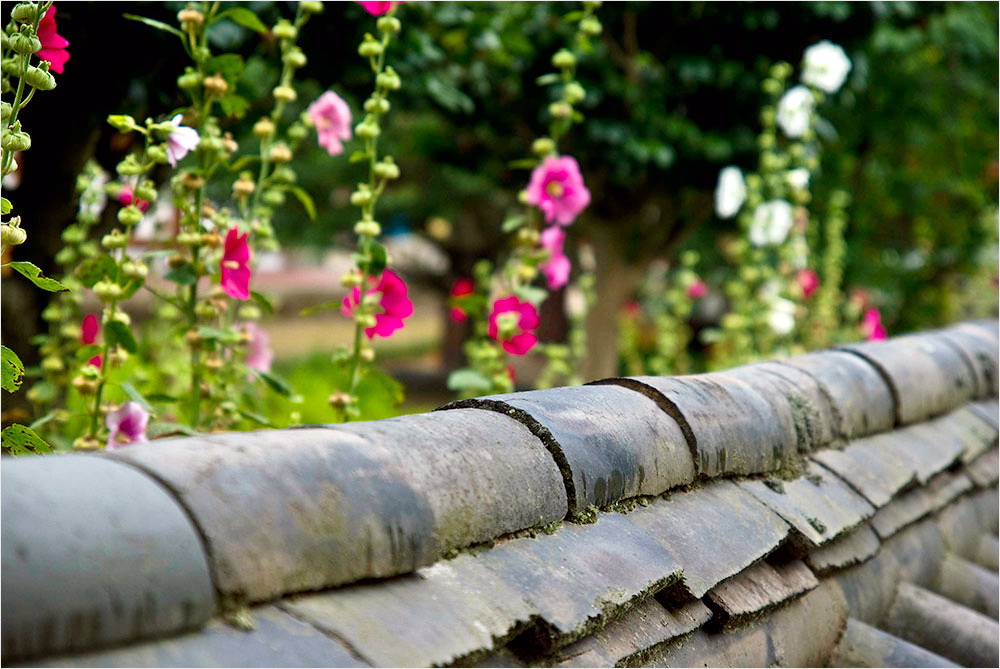 담장에 가지런히 덮인 기왓장의 고색창연 위에 고개를 내민 키 큰 빨갛고 하얀 접시꽃의 행렬은 이 절집에 서린 여인들의 향기 같은 것. 어느 전각 앞 댓돌에 나란히 놓인 검정 샌들과 중고생들이 신는 흰빛 무용화의 앙상블만큼이나 그것은 쓸쓸한 울림으로 다가온다.