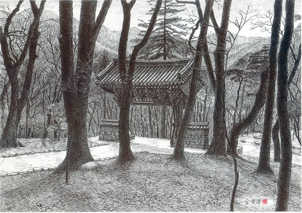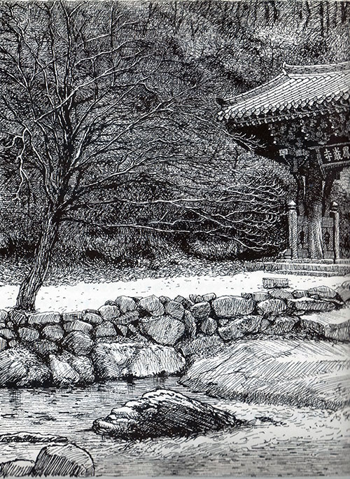 펜화는 말 그대로 펜으로 그린 그림이다. 펜은 우리의 붓과 달리 ‘뾰족하고 딱딱해서 가늘고 길게 그을 수 있는’ 필기구다. 보름 동안 50만 번의 선을 긋는 제의와도 같은 과정을 거쳐 한 장의 펜화가 태어난다. 따라서 그 한 장의 그림을 그리기 위해 그는 여러 차례 대상을 바라보고 칼질처럼 정교한 선을 그으며 그것을 자신의 내면에 갈무리하고 대상에 담긴 천년의 세월을 살려낸다.