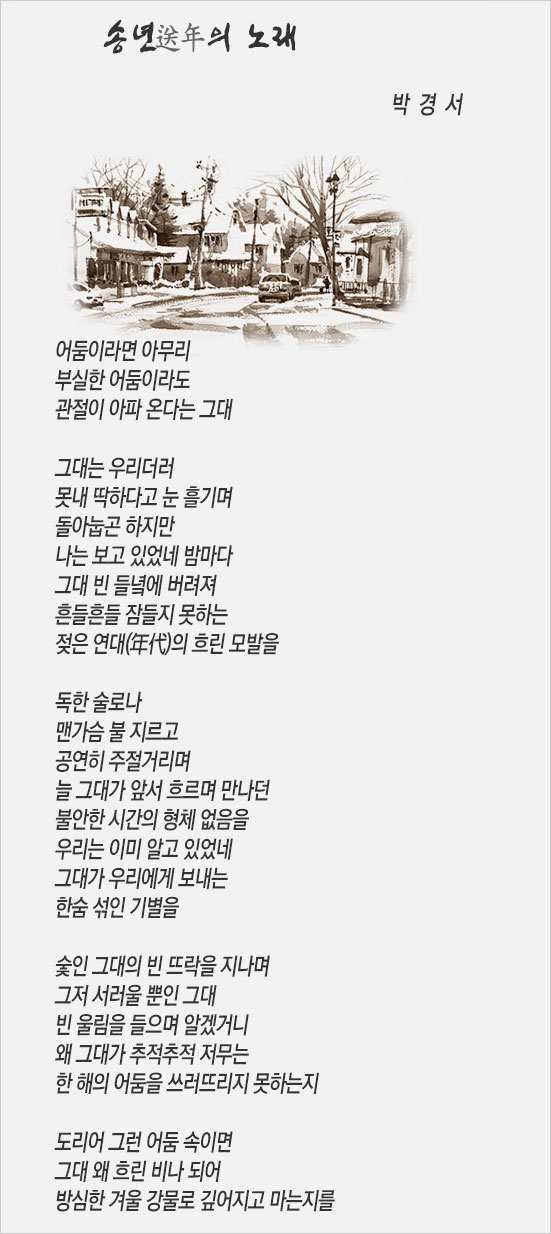 시가 33편, 콩트를 포함한 소설이 모두 8편이었다. 나는 그것을 그의 아내와 부모님, 그리고 가장 가깝던 후배에게 건넸다. ‘송년의 노래’는 바로 그 책자 속에 든 시다. 그는 고교 시절 내내 그리고 대학에 들어와서도 시를 썼다.