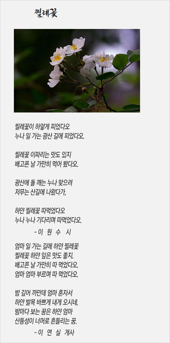 그러고 보면 찔레꽃은 서민들의 고단한 삶과 가난을 증언하는 꽃이다. 찔레꽃은 보릿고개를 힘겹게 넘던 시절의 어린이들 곁을 지켰던 꽃이기 때문이다. 아이들의 허기와 무료를 달랬던 찔레 순과 그 하얀 꽃은 절대빈곤의 시대에 대한 원초적 기억이다.