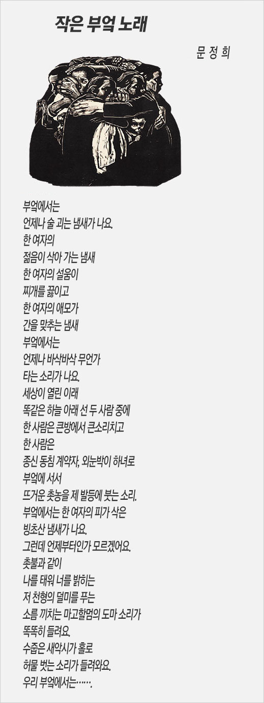 어느새 전 부치는 냄새가 좁은 실내를 가득 채운다. 어저께 우연히 만난 문정희 시인의 시 ‘작은 부엌 노래’를 읽는다. ‘불평등한 결혼 제도’를 비판하면서 페미니즘의 시각에서 여성과 ‘여성의 변화’에 대해 성찰하고 있는 맞춤한 시다. [시 전문 텍스트 읽기]