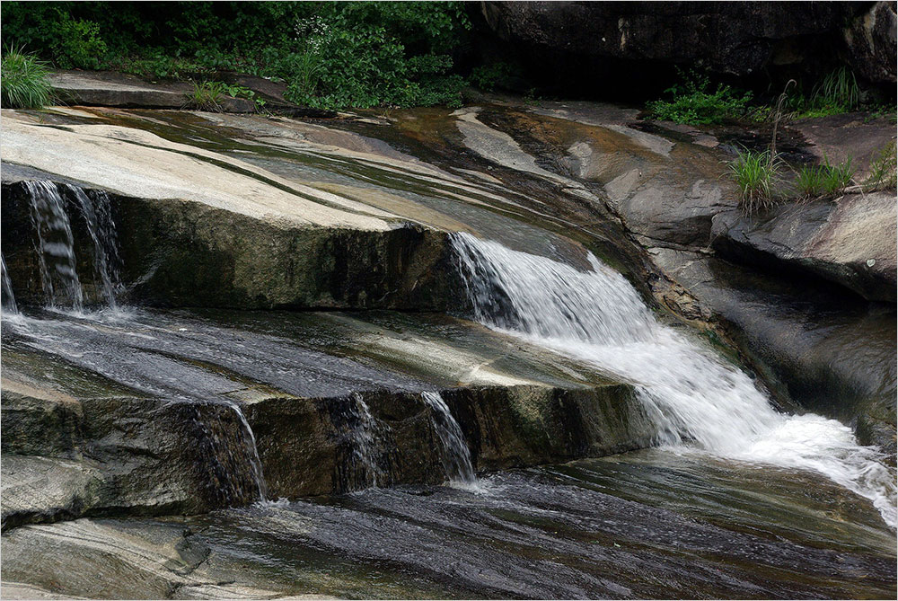 수량에 따라 달라지긴 하지만 정자로 가는 울창한 숲 사이에 숨어 있는 이 폭포는 내륙에선 보기 드문 장관을 보여준다. 걸음을 멈추고 깎아지른 골짜기의 비탈에 서서 내려다보면 짙푸른 소(沼)에 내려꽂히는 세 줄기 물보라의 폭포는 말 그대로 신선한 경이다.