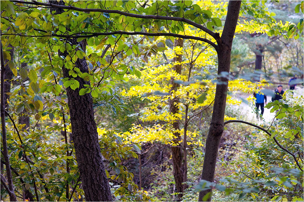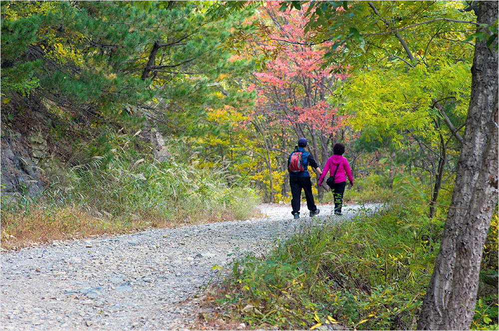 팍팍한 다리를 위로한 것은 연도의 풍경들이었다. 아내와 딸애는 연신 탄성을 질러댔다. 정말 좋다! 그 외마디 감탄사 속엔 ‘힘들지만 오길 잘했다’는 속내가 담겨 있었음을 틀림없다. 하늘은 맑은 청잣빛! 널찍한 임도 양옆으로 따라오는 숲은 바야흐로 단풍이 들고 있는 중이었다.