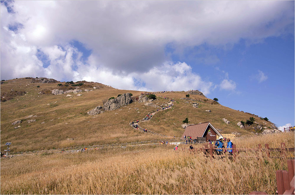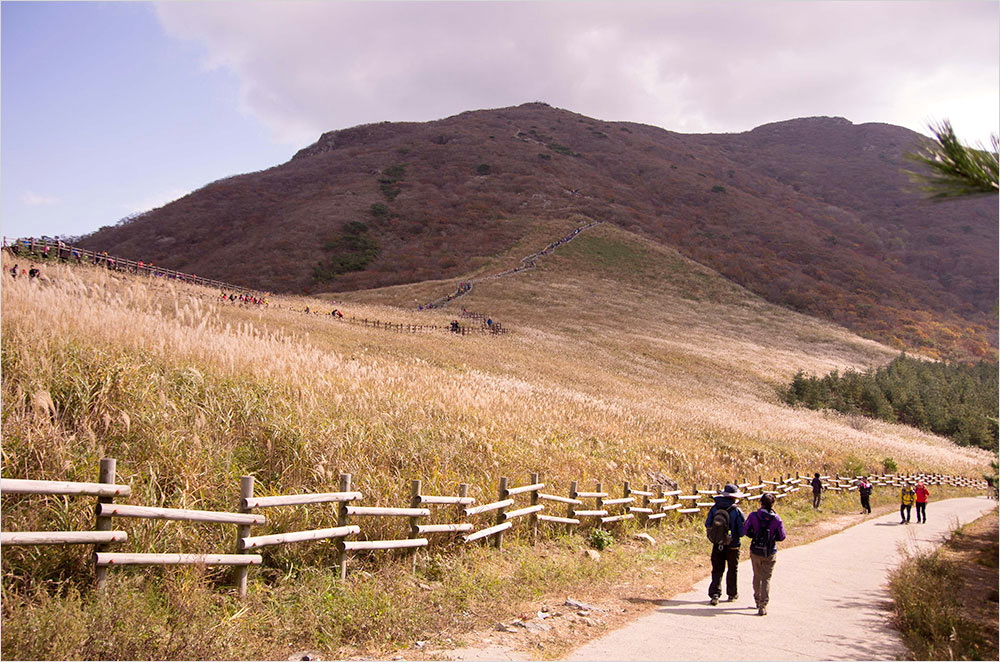 나는 좀 당황스러웠다. 계속해서 ‘다 와 간다’는 말로 위로하며 끌고 왔지만, 상황은 꽤 심상찮은 상태다. 어떡하나, 머리를 굴리며 모퉁이를 돌자, 쭉 벋은 길 저편으로 새파란 하늘과 나무와 숲 대신 억새가 빽빽하게 들어찬 산등성이가 나타났다. 만질만질한 그 능선에 구불구불하게 이어진 길은 억새 하늘길, 간월재였다.