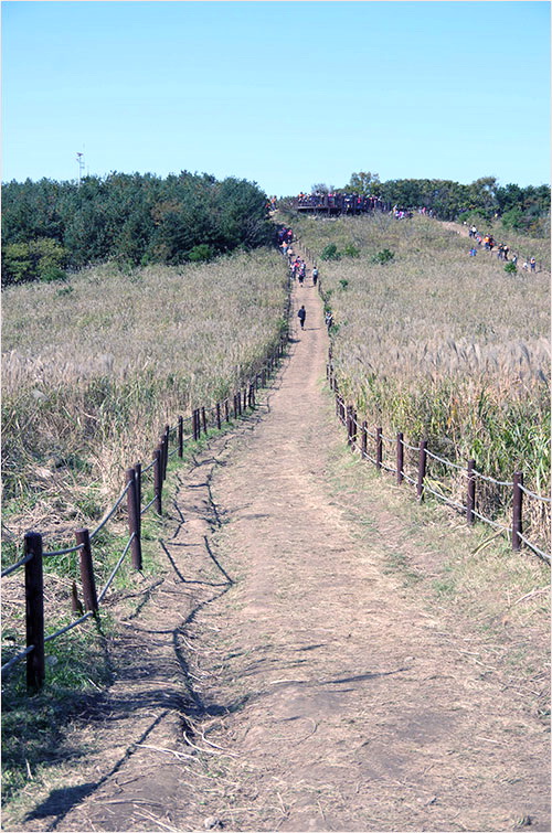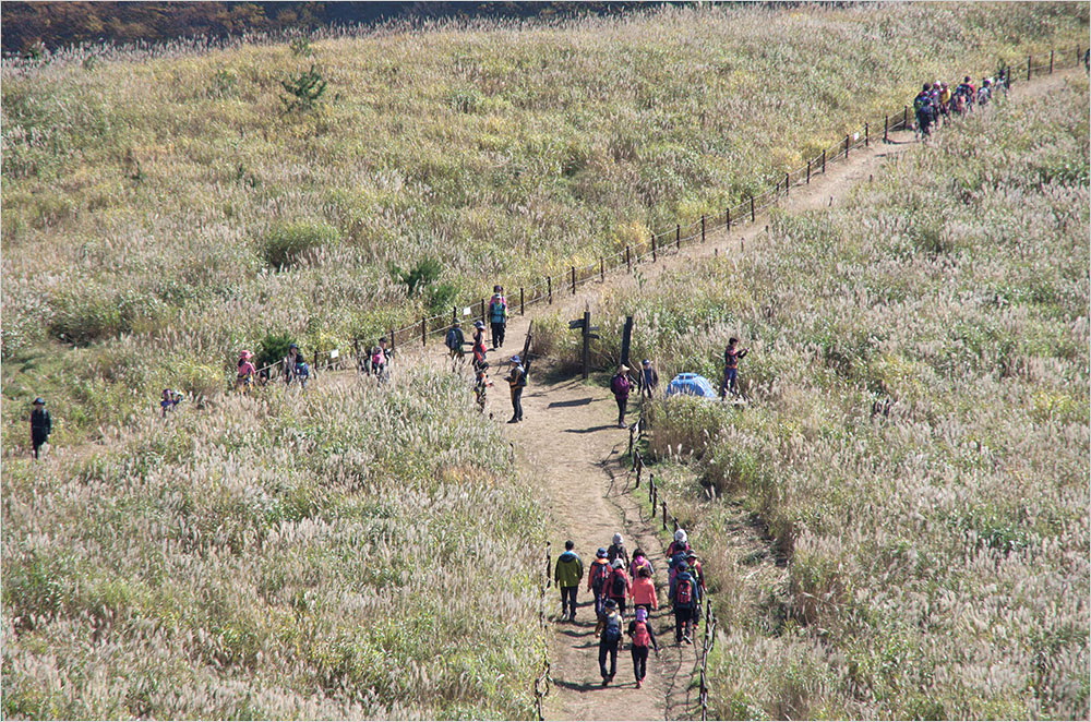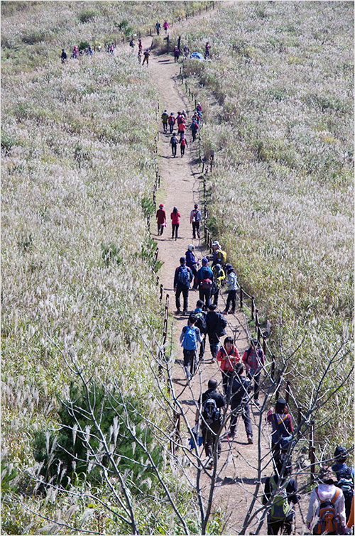 간월재에서와 같은 하얗게 빛나던 억새의 물결을 만나려면 얼마쯤의 시간이 더 필요할까. 언제나 그렇듯 좋은 풍경을 만나는 일은 절대 쉽지 않다. 그것은 언제나 조금 이르거나 조금 늦곤 하니 말이다. 억새 군락 주변 길은 곳곳에서 기념촬영을 하는 사람들의 원색 등산복으로 어지럽다.