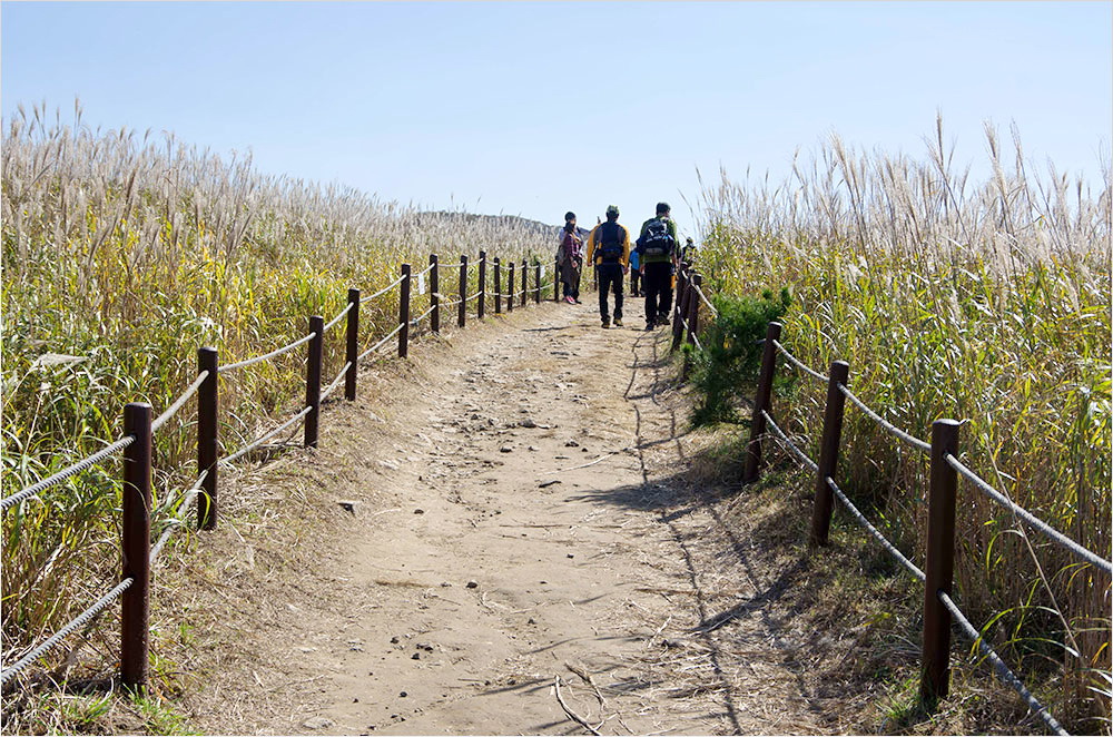 무장봉에서 무장사지를 거쳐 내려오는 길은 경사는 완만하나 단조롭고 멀었다. 중턱쯤에 ‘돼지풀 확산 방지를 위한 억새 식재 지역’이 있다. 돼지풀은 자생식물의 서식지를 위협하고 알레르기성 비염과 호흡기 질환을 일으키는 북아메리카 원산의 귀화식물이다. 억새 식재는 돼지풀의 확산을 막고 무장봉의 경관에도 도움이 된다고 한다.
