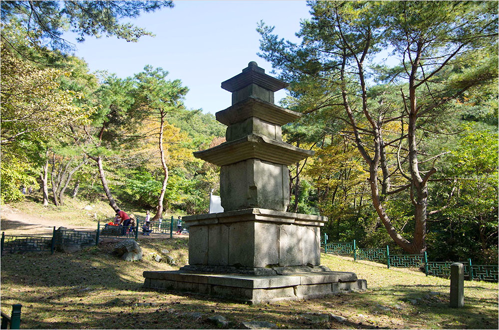 사적비가 서 있는 평지 아래 산비탈에 삼층석탑(보물 126호)이 있다. 2단의 기단 위에 3층의 탑신을 올린 전형적인 신라 석탑이다. 원래 무너진 채 깨어져 있었던 것을 1963년 일부를 보충하여 다시 세웠다고 한다. 기단부에 새겨둔 안상(眼象)으로 미루어 볼 때 9세기 이후에 건립된 것으로 추정된다는 돌탑은 저물어가는 햇살 속에서 좀 외로워 보였다.