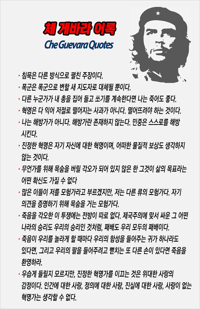 체 게바라는 <게릴라 전쟁>(1960), <혁명전쟁 여행>, <라틴 여행일기>(영화 <모터사이클 다이어리>의 원작), <체의 일기>, <먼 저편> 등의 저서도 남겼다. 그가 남긴 말과 글에서 뽑은 ‘어록’의 무게도 만만찮다.