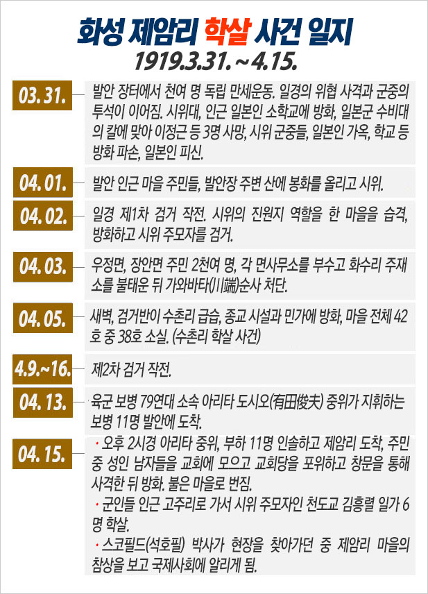 제암리 학살과 비슷하거나 오히려 더 큰 희생이 빚어진 사건도 아우내장터 만세운동 등 12건에 이른다. 학살의 피해는 시위를 주도한 소수의 사람들뿐 아니라 시위에 참여한 무명의 동포들에게 오히려 더 컸다. 나라 잃은 백성의 감내해야 했던 설움과 분노는 뒷사람들이 상상하는 것 이상이었던 것이다.