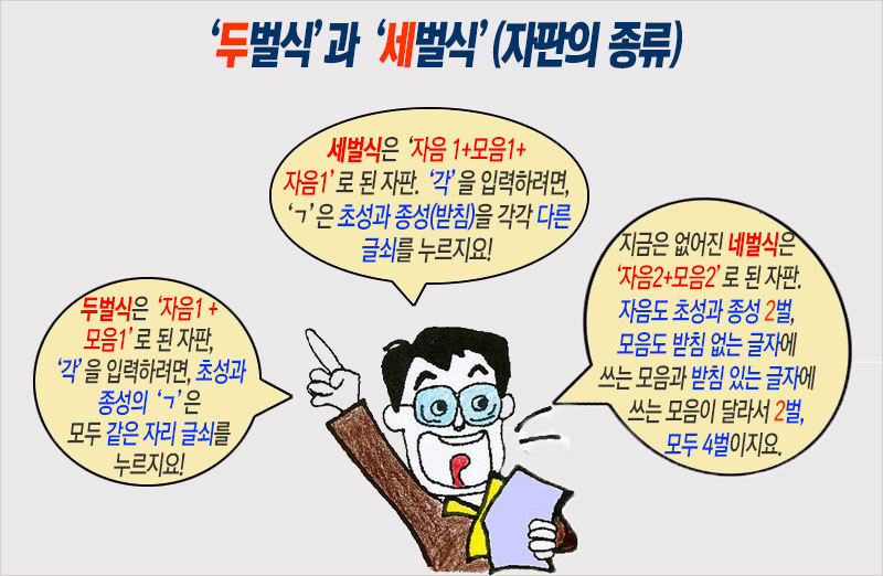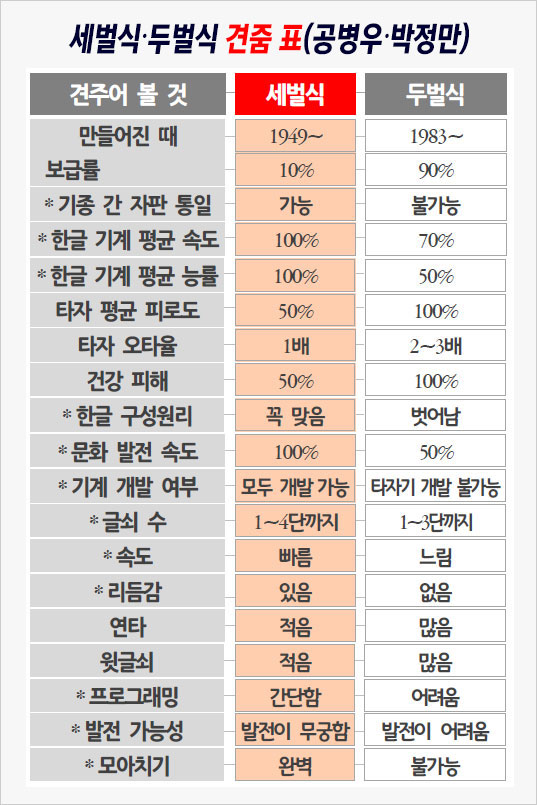 두벌식과 세벌식 자판을 비교한 아래 표를 보면 명확해진다. 우선 보급률에서 현격한 차이가 있다. 두벌식이 90%인데 반해 세벌식은 고작 10%다. 그러나 나머지 모든 항목 간 비교에서 두벌식은 맥을 추지 못한다.