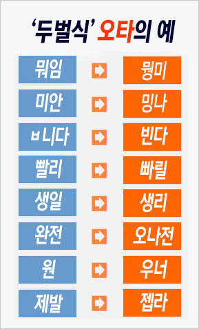두벌식 사용자라면 위의 표에 드러난 ‘두벌식 오타’가 아마 눈에 익을 것이다. 이 오타는 받침과 다음 글자의 초성 입력이 제대로 안 되면서 둘째 음절의 초성과 받침이 뒤바뀌어 버리는 형태로 나타나는 특징이 있다. ‘뭐임’은 ‘뭥미’가 되고 ‘빨리’는 ‘빠릴’이, ‘완전’은 ‘오나전’이 된다. ‘제발’은 ‘젭라’가 되어 버린다. 초성과 받침이 분명하게 구분되는 세벌식에서는 일어날 수 없는 오타다.