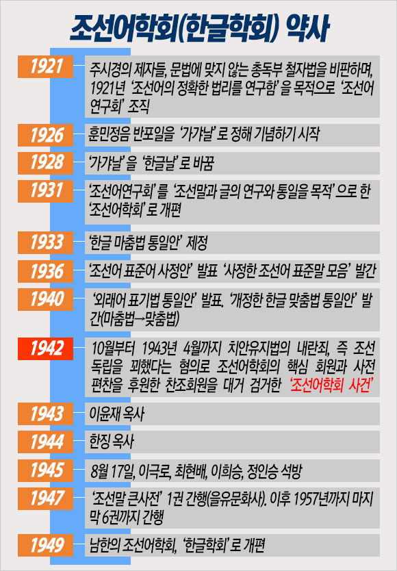 1942년 10월 1일, 일제는 ‘민족의식을 고양했다’는 죄목으로 한글을 연구하는 조선어학회 소속 학자들을 검거 구속하기 시작했다. 이른바 ‘조선어학회 사건’이었다. 1942년 10월 1일부터 이듬해 4월 1일까지 모두 33명의 한글학자가 검거되었고, 증인으로 붙잡혀간 이들도 48명에 이르렀다.