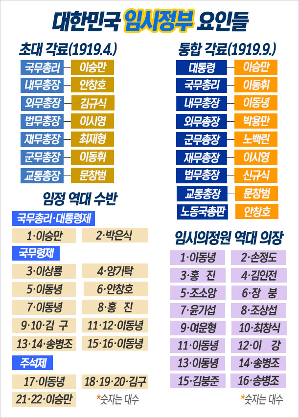 임정은 내각제를 선택하여 국무총리에 이승만, 안창호(내무총장), 김규식(외무총장), 이시영(법무총장), 최재형(재무총장), 이동휘(군무총장), 문창범(교통총장) 등으로 첫 내각을 꾸렸다. 이틀 후(4월 13일) 임정은 대한민국 임시정부의 수립을 세상에 알렸다. 임시정부 수립기념일은 이 공포일을 기준으로 제정된 것이다. ( 애초 4월 13일을 공식적인 기념일로 제정하였다가 임시정부 수립 100주년을 맞이하는 2019년에 4월 11일로 기념일을 변경하였다.)