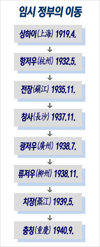 상하이에서 수립되어 흔히 ‘상해 임정’이라고 불리지만, 임정은 수립 이후에 여러 도시를 전전해야 했다. 임정은 1932년 4월 윤봉길 의사의 훙커우(虹口) 공원 의거 이후 항저우(杭州)로 이전할 때까지 13년 동안 상하이에서 활동했다. 나머지 도시 가운데 충칭(重慶)에서 활동한 시간이 5년으로 가장 길고 나머지는 1~2년이거나 불과 몇 달에 불과하니 역시 임정은 ‘상해 시대’가 중심이었다고 할 수 있다.