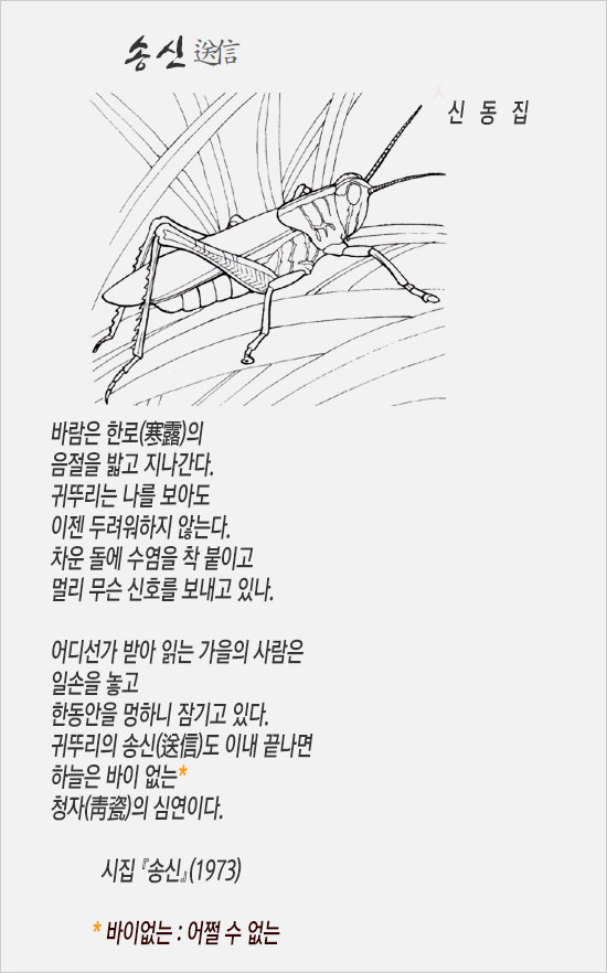 그러나 가을 “하늘은 바이없는 / 청자의 심연이다.” 유한자(有限者)에 불과한 생명, 그 조락이나 죽음과 대조적으로 자연은 그렇게 초연한 모습인 것이다. 이 시를 발표한 것은 1973년, 시인이 40대 후반일 때다. 한로 무렵의 귀뚜라미의 울음소리를 들으며 ‘시간의 순환과 죽음’을, ‘유한자적 존재의 비애’를 노래한 시인은 지난 2003년에 세상을 떠났다.