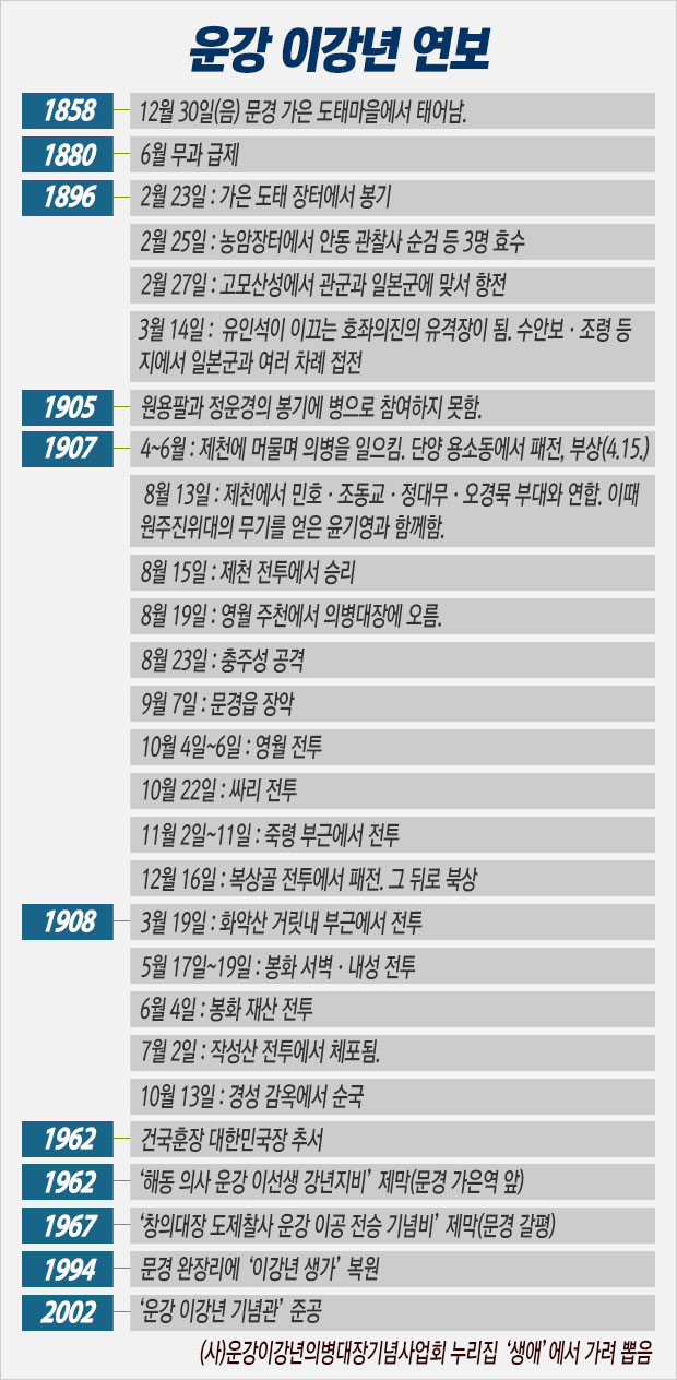 1908년 10월 13일, 경성감옥에서 십삼도창의군의 호서창의대장 운강 이강년(李康秊, 1858~1908)의 교수형이 집행되었다. 지난 6월, 충청도 청풍과 작성에서 벌어진 일본군과의 결전에서 발목에 총알을 맞고 붙잡혀 7월에 서울의 일본군 헌병사령부로 압송되었다가 9월 22일에 교수형을 선고받은 지 스무하루 만이었다. 향년 50세.