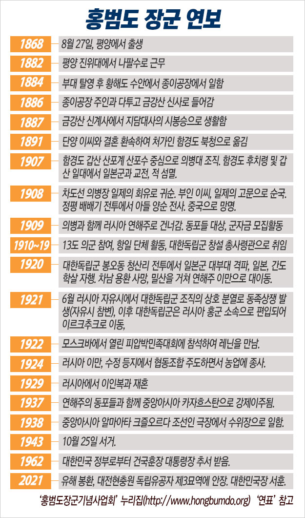 오늘(25일)은 홍범도 장군 순국 80주기 추모 및 청산리전투 전승 103주년 기념식이 대전현충원에서 열린다고 한다. 국가보훈부는 오늘 오전 11시부터 대전현충원에서 박민식 국가보훈부 장관과 우원식 기념사업회 이사장, 독립유공자 유족 등 100여 명이 참석한 가운데 추모식과 기념식이 거행된다고 한다.