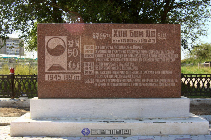 1962년 대한민국 정부는 홍범도 장군에게 건국훈장 대통령장 추서했다. 1984년 11월 초에 크즐오르다 묘역에 장군의 반신 동상이 세워졌고, 1989년 5월 26일 크즐오르다에 ‘홍범도 거리’가 명명되었다. 그것만으로 이국에 묻힌 노 독립투사의 한은 얼마간 위로를 받게 될는지.