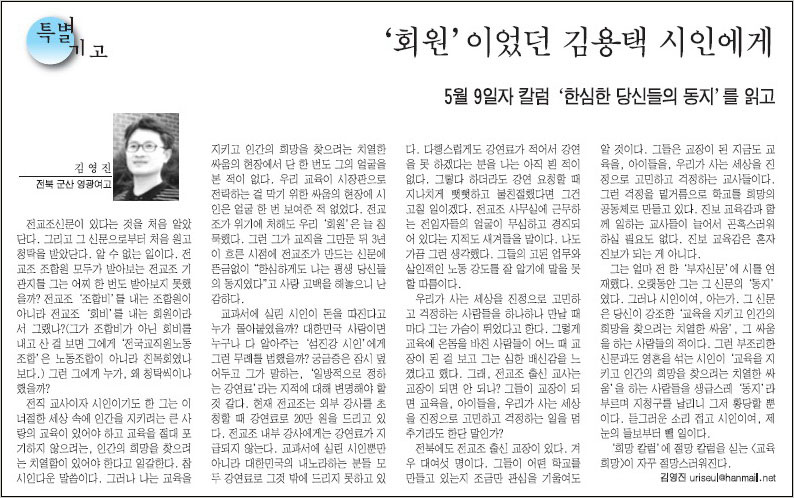 오늘 아침, 책상 위에 기관지 <교육희망> 22주년 특집호가 놓였다. 지면을 뒤적이는데 기사 하나가 눈에 띄었다. 전북 군산의 한 고교에서 근무하는 조합원이 쓴 기산데, 시인 김용택이 지난 호에 실은 칼럼에 대한 ‘반론’이었다.